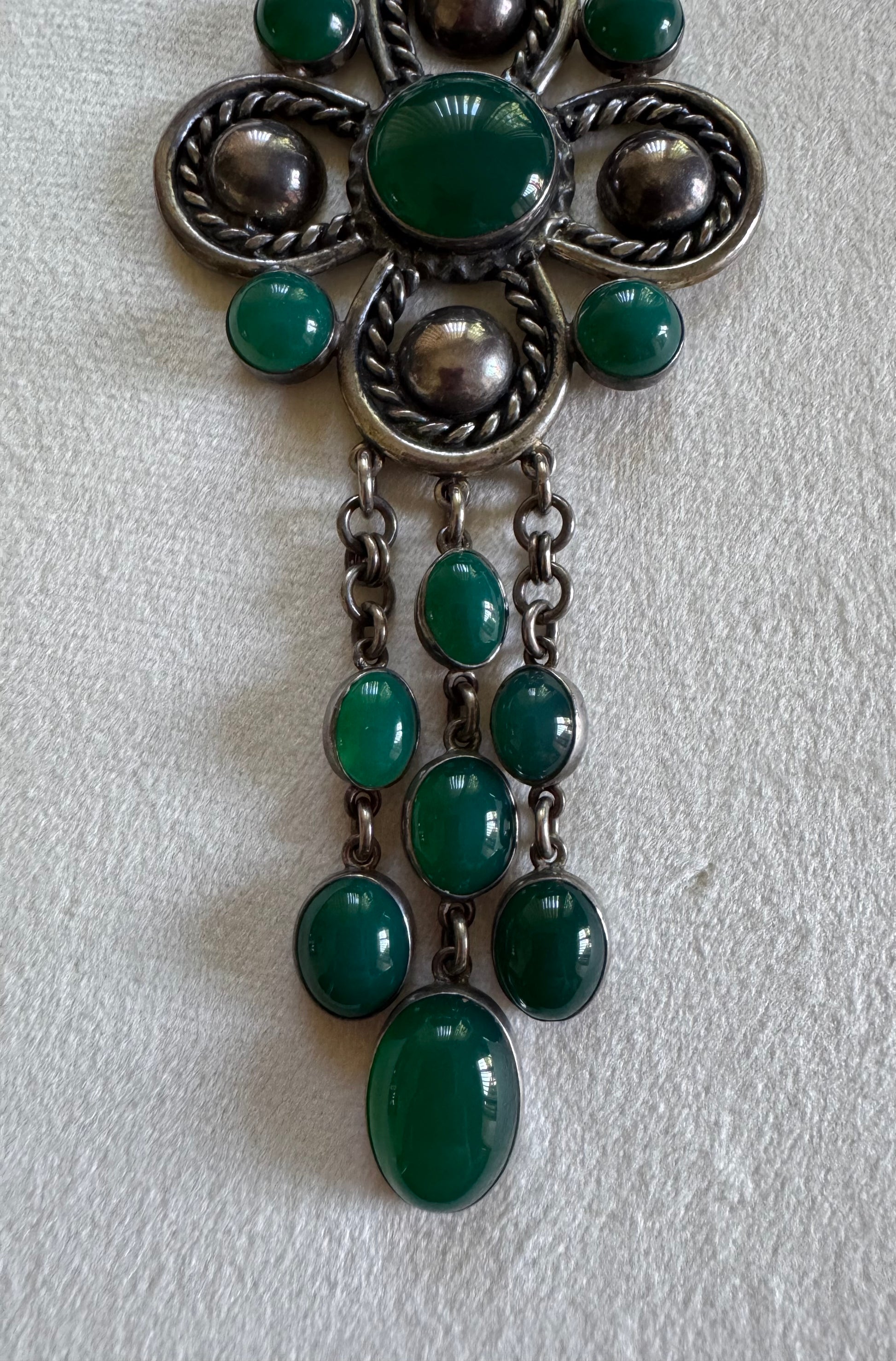 This striking handmade necklace is crafted from solid sterling silver and set with 16 vibrant green chrysoprase cabochons. The bold design features a dramatic central cross-like medallion accented with twisted rope detailing, silver beads, and cascading gemstone drops that create graceful movement.