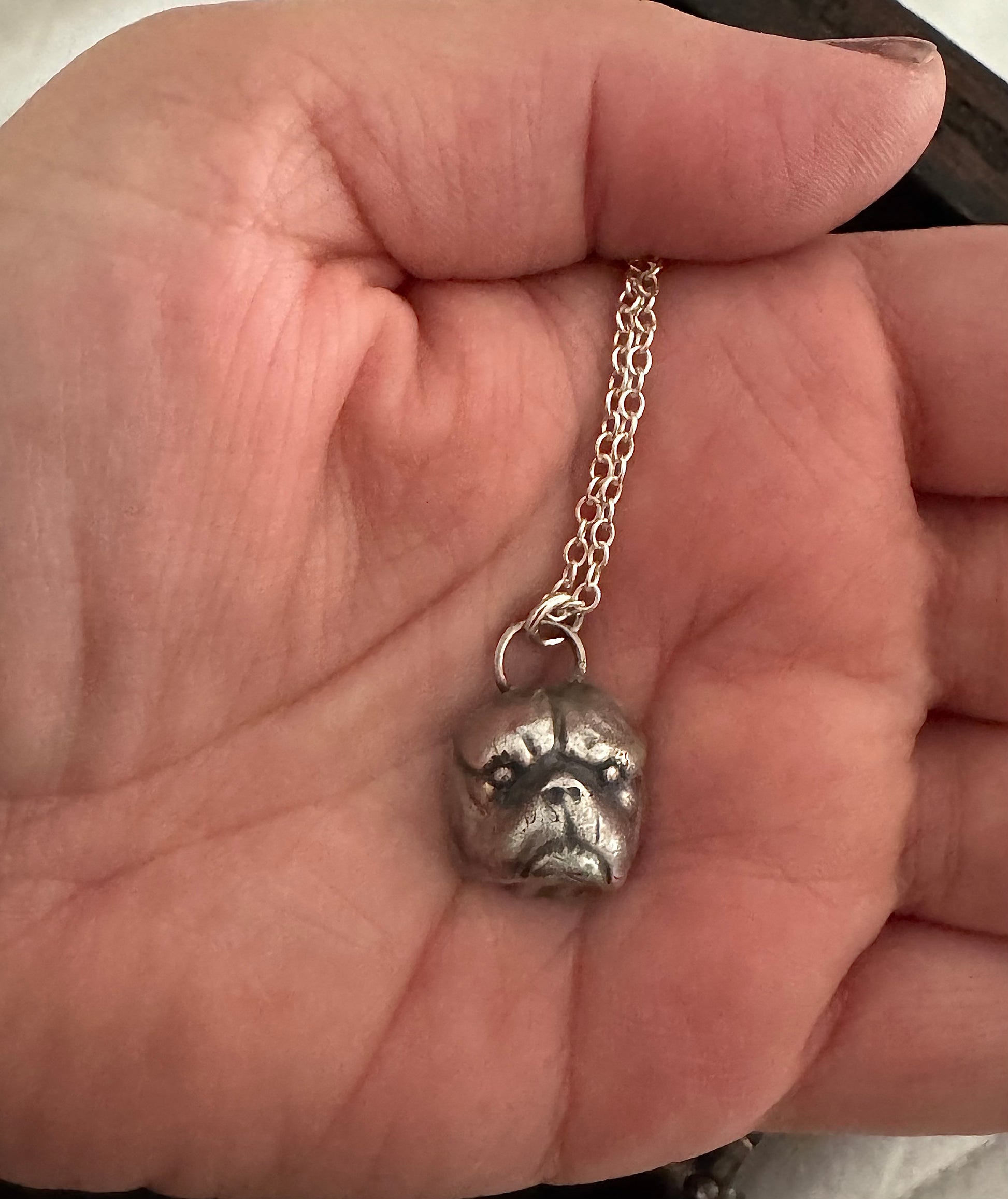 This handcrafted bulldog necklace is a perfect blend of artistry and personality. The pendant is made from .999 pure silver metal clay, shaped and fired by hand to create a charming and detailed bulldog design with a slightly rustic, organic finish. It hangs from a sterling silver chain that adjusts from 15 to 17.5 inches, allowing for versatile styling.