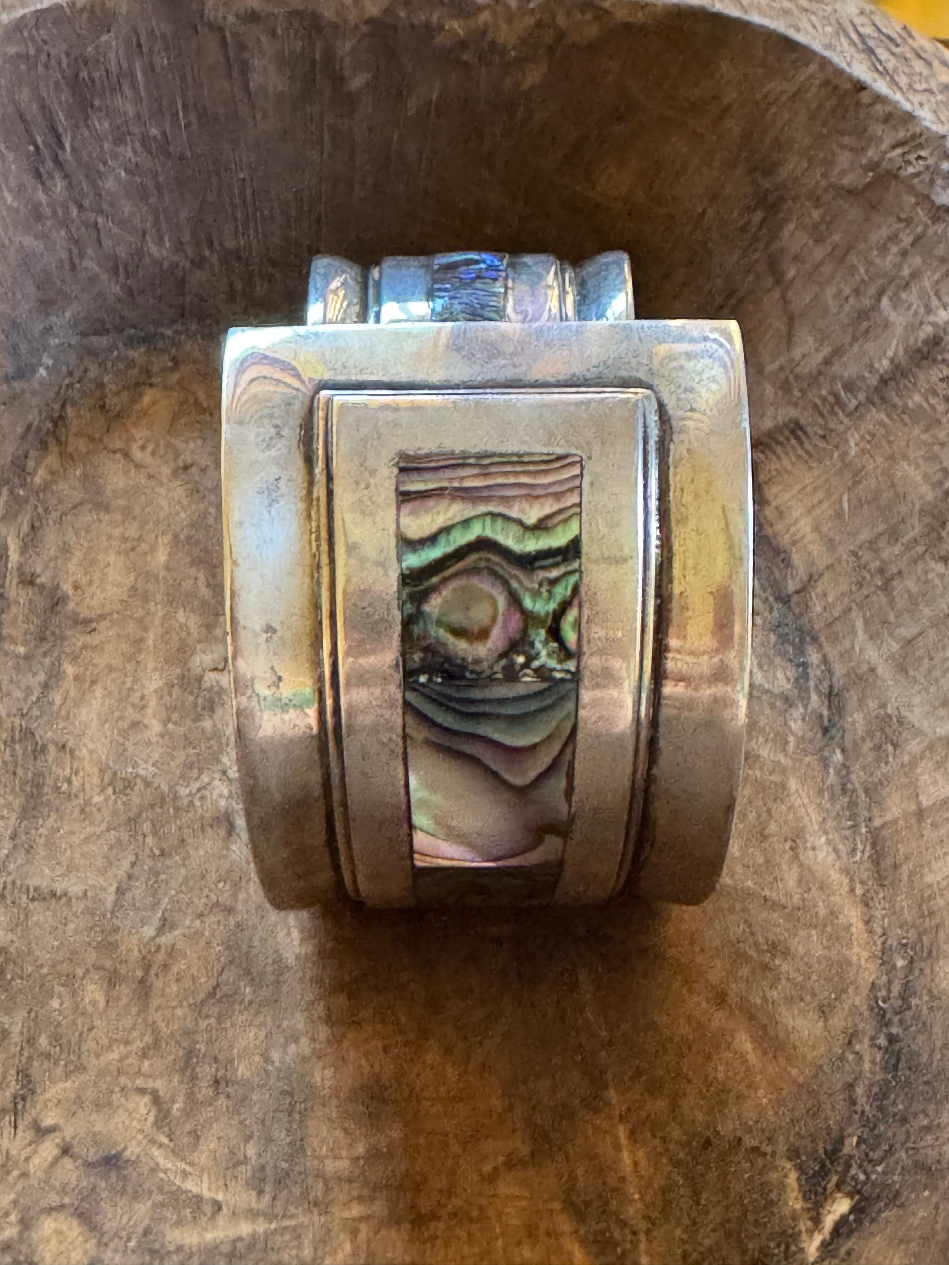 This bold and sculptural sterling silver hinged bracelet features panels of vibrant abalone shell inlay, showcasing natural iridescent hues of green, blue, and violet. The design combines modernist lines with organic texture, creating a striking balance between clean geometry and oceanic beauty.