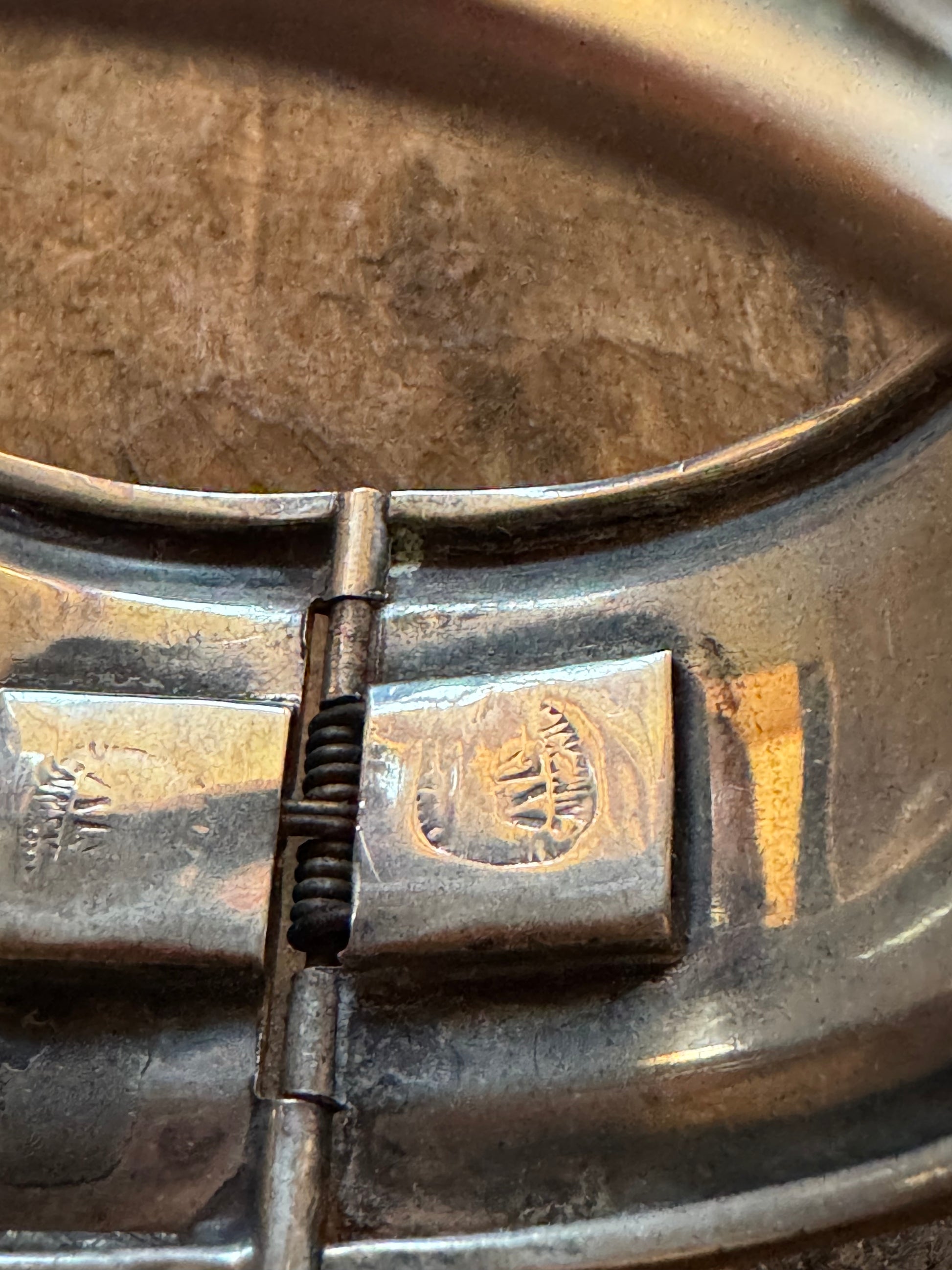 Weighing 3.4 ounces, this bracelet feels substantial and well-crafted, with a hinge mechanism that allows it to open smoothly and fit comfortably around the wrist. The interior is stamped “Mexico” along with an unreadable maker’s mark, suggesting artisan or workshop production.