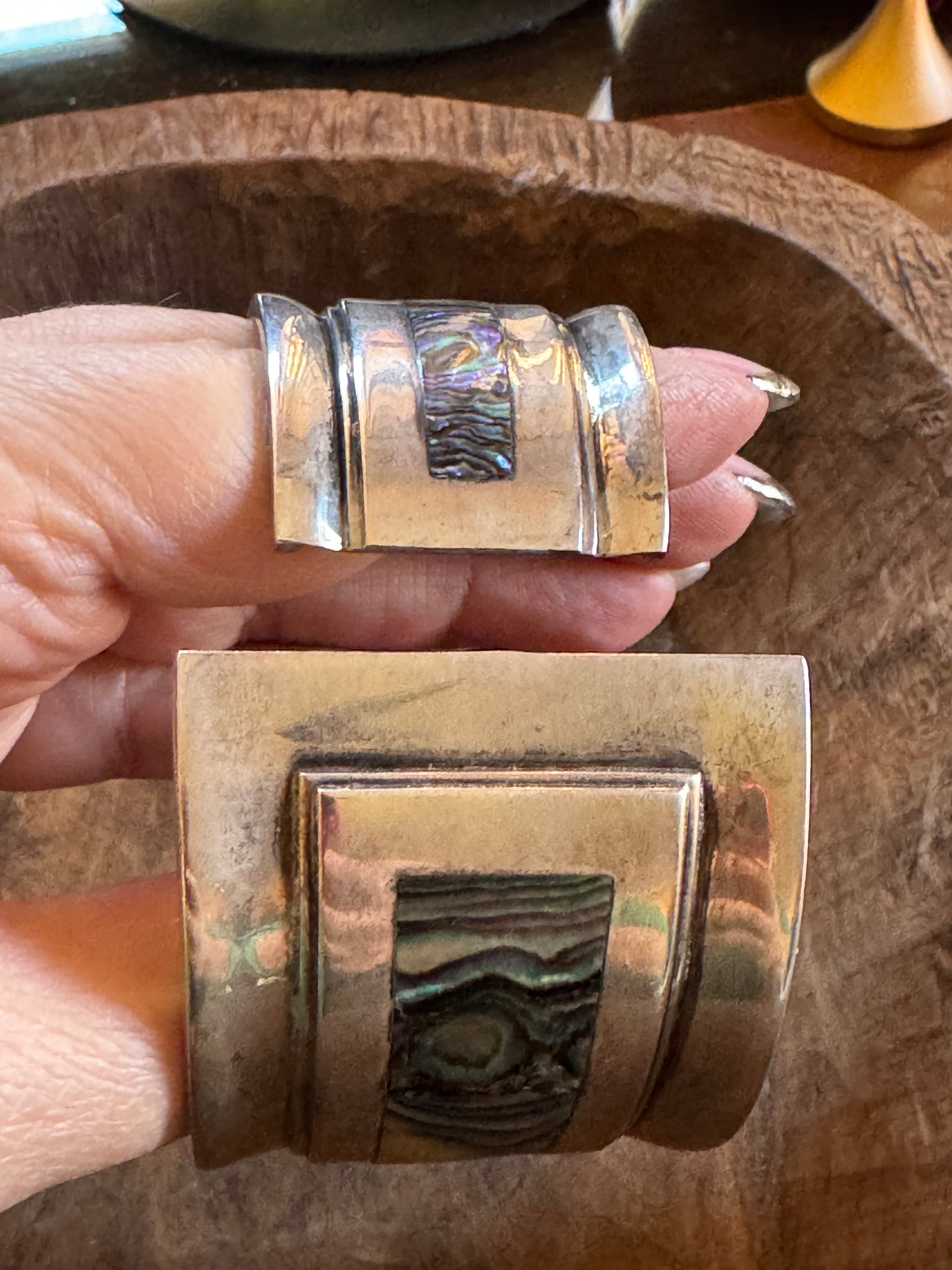 The rectangular abalone inlays are deeply set within framed silver sections, giving depth and dimension to the bracelet's design. A natural patina adds warmth and authenticity, highlighting the craftsmanship and age of the piece.