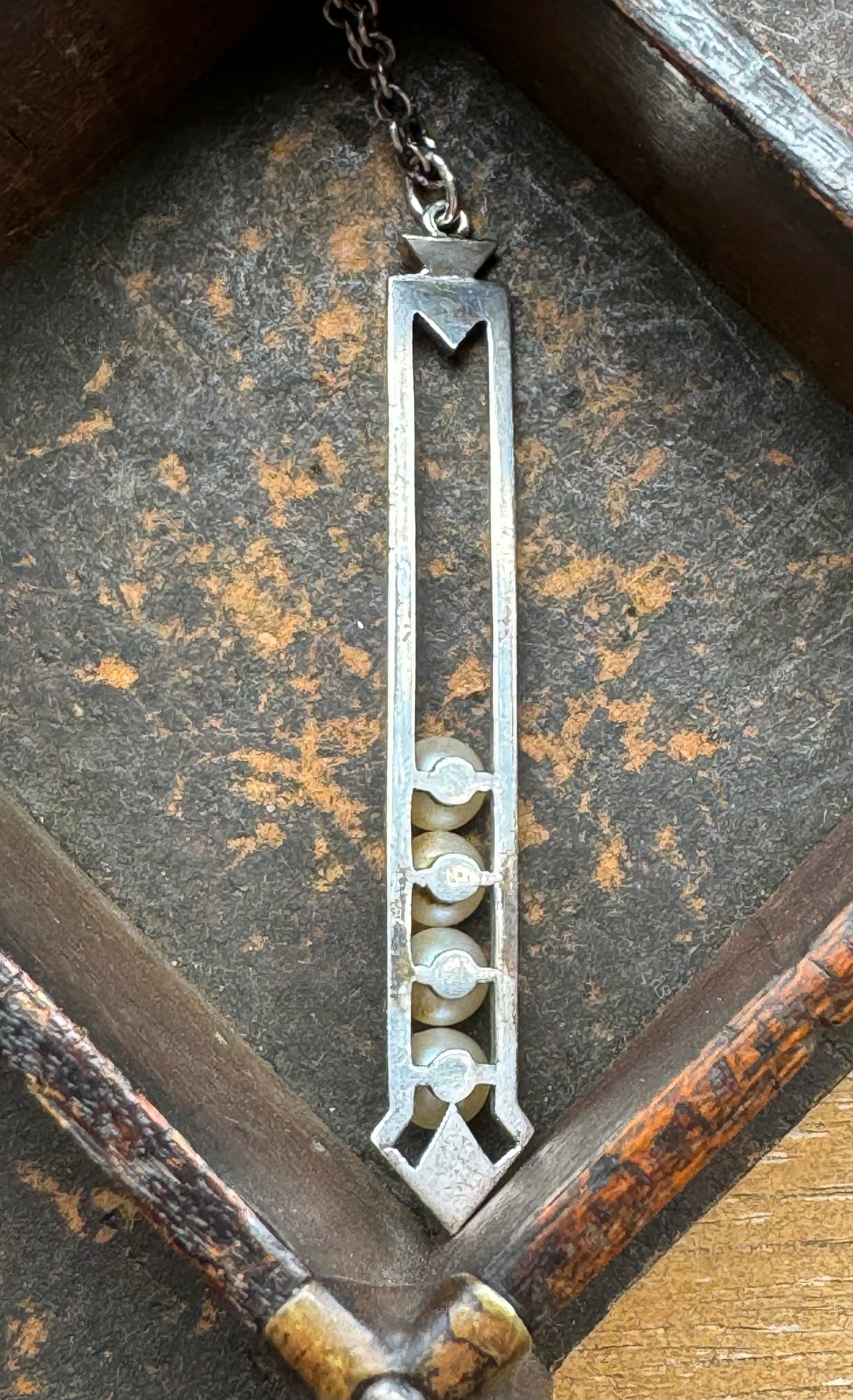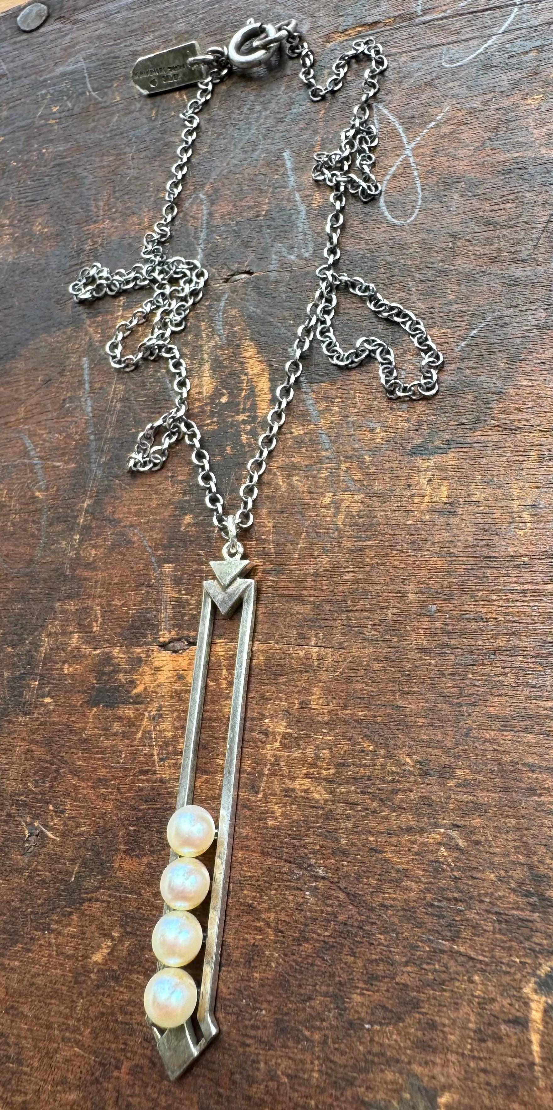 This striking necklace is a rare fusion of mid-century sophistication and modern craftsmanship. Once a 1950s Mikimoto tie bar, I have repurposed it into a one-of-a-kind pendant featuring four luminous, cream colored iridescent pearls set within an elongated, open-frame sterling silver form. Clean lines and bold angles give this piece a distinctly modernist flair, while the pearls add a touch of timeless elegance.