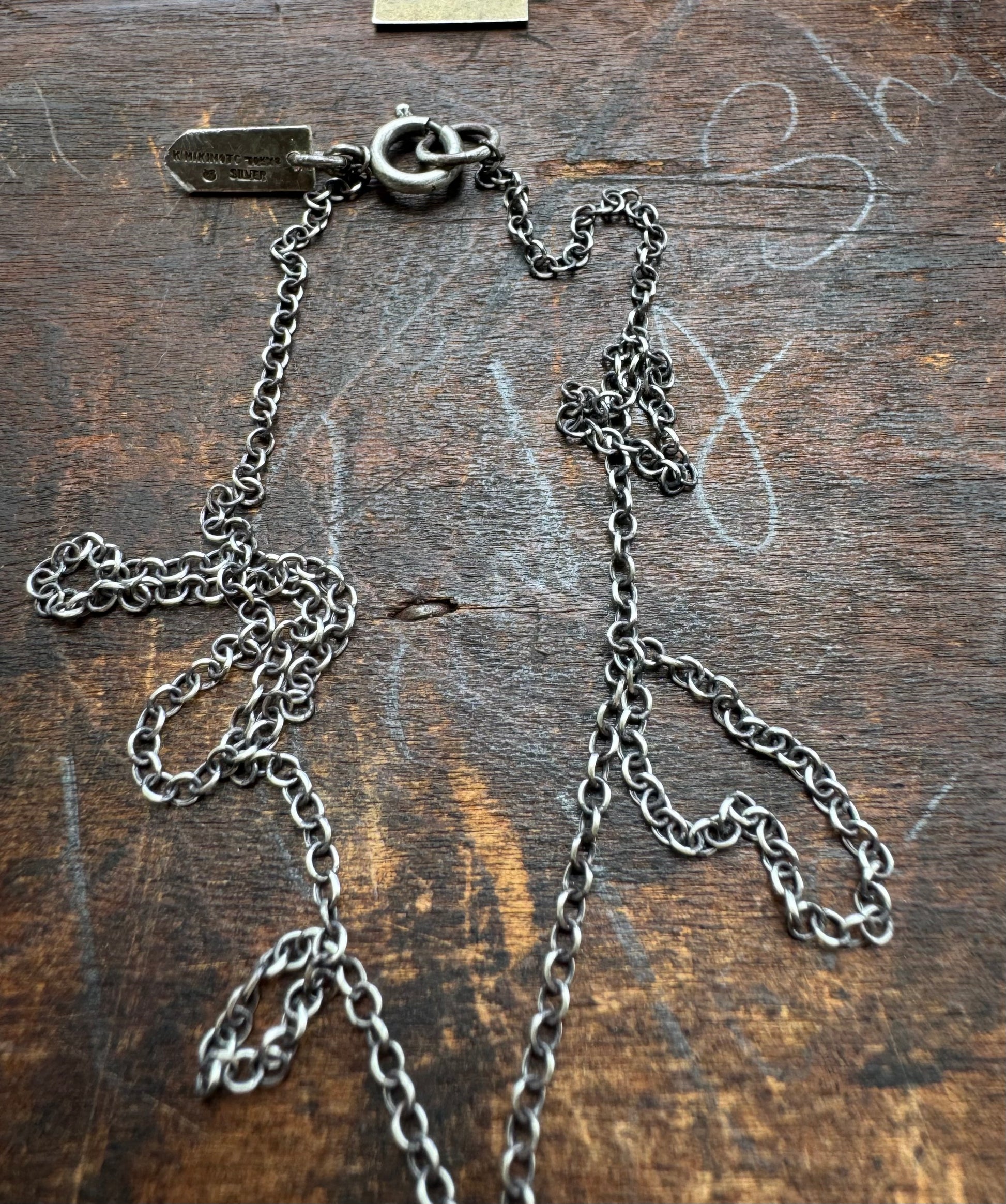 Hanging from an 18" sterling silver chain, the necklace is both lightweight and statement-making. As a tribute to its origins, the original Mikimoto tag from the tie tack has been preserved and attached to the clasp, adding provenance and a unique detail collectors and vintage lovers will appreciate.